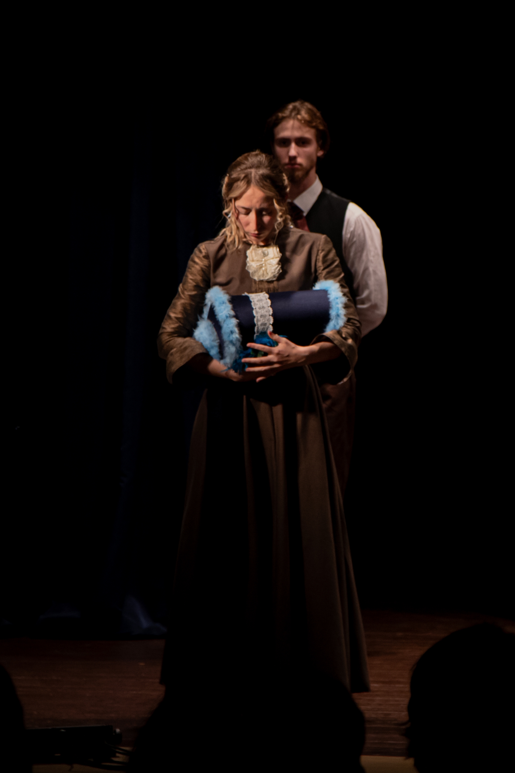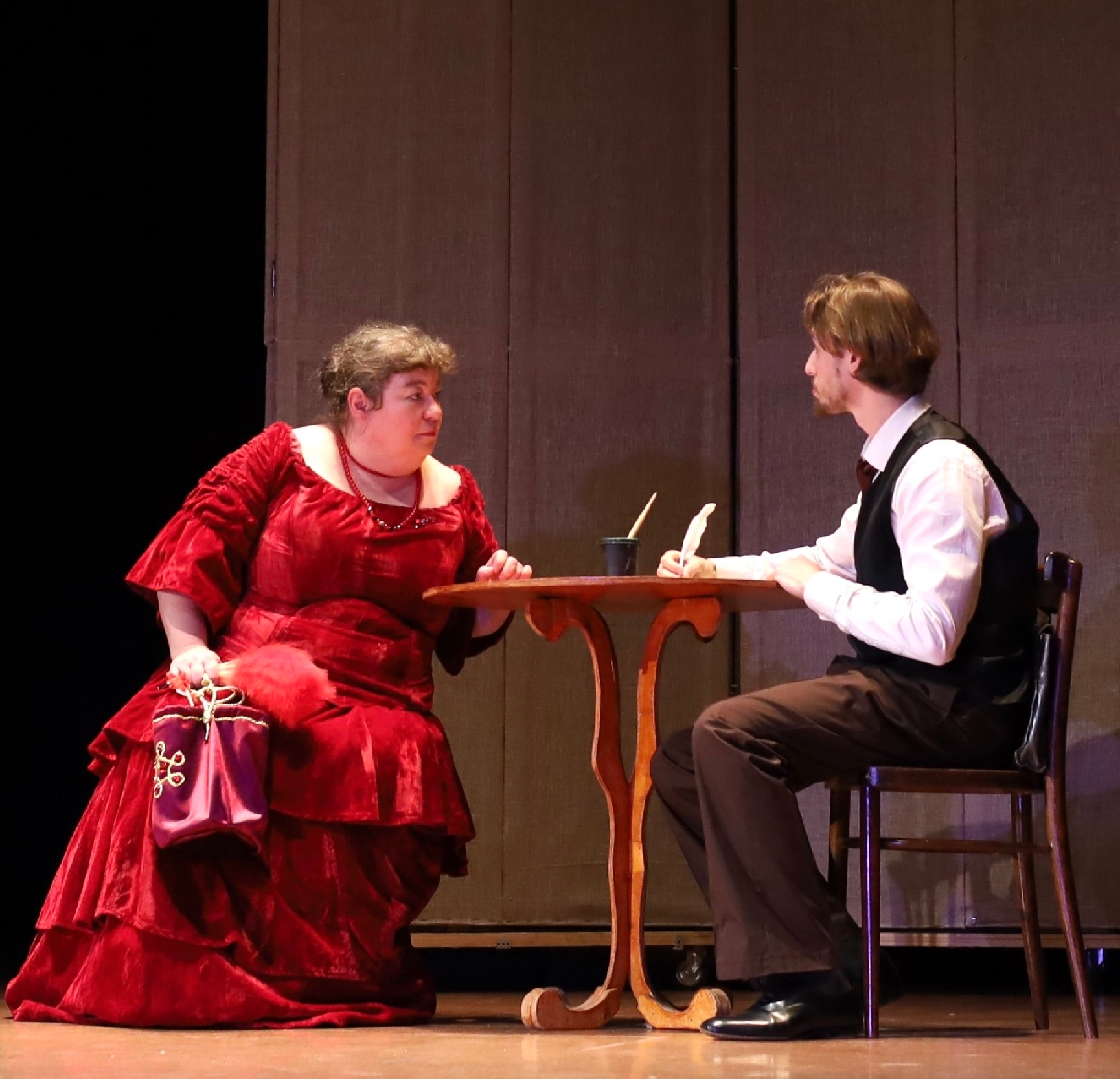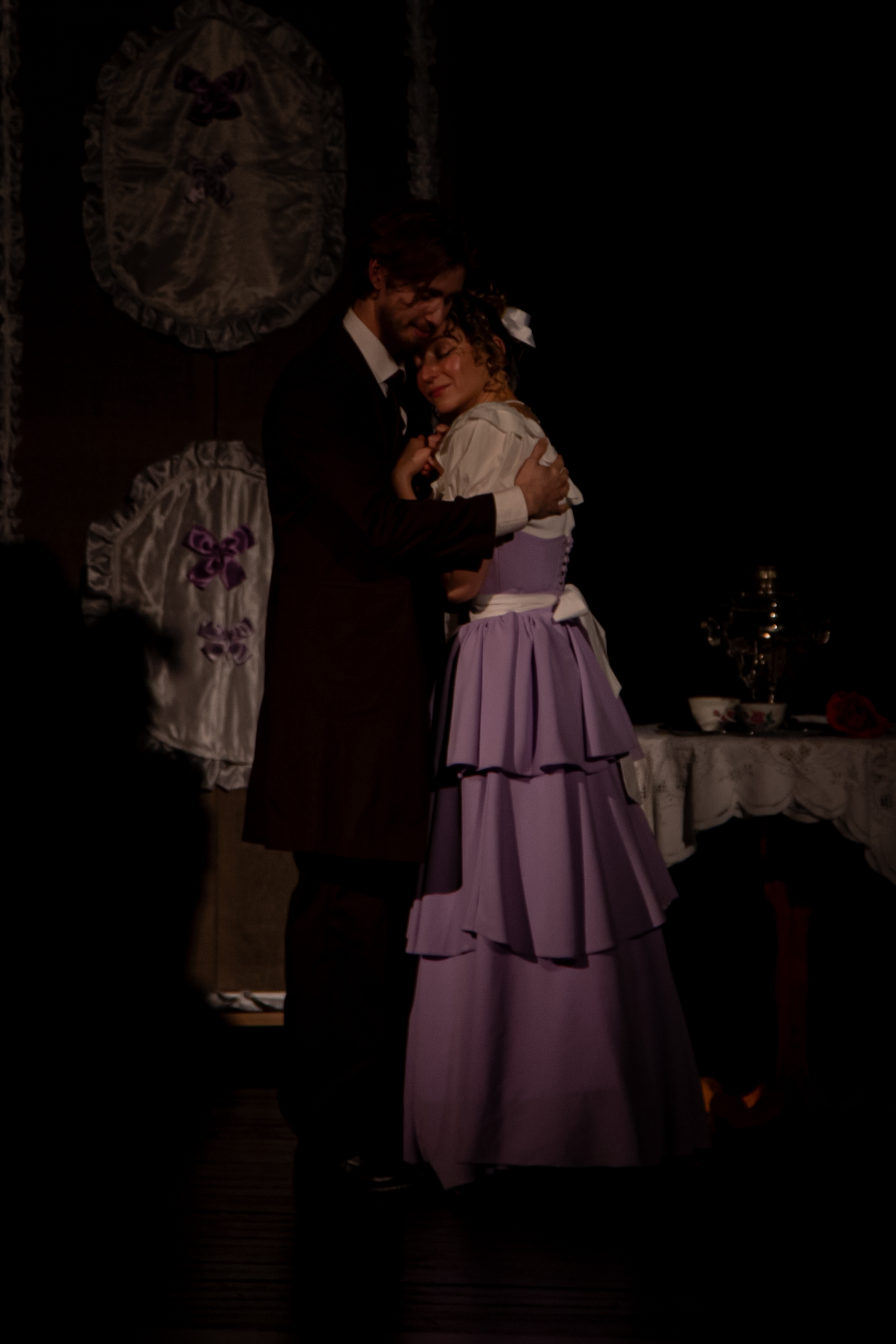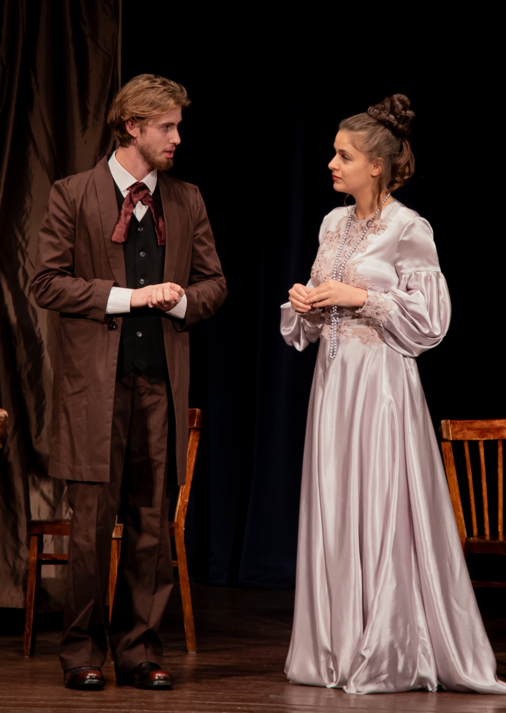 Валерия Житникова в роли Полины и Денис Лученков в роли Жадова. Дебюты. "Доходное место" от 2025 года - спектакль восстановленный. Часть актеров играет в нем еще с 2015 года, когда спектакль только вышел на сцену Одинцовского Народного театра, но значительная часть - дебютанты в своих ролях. Из "стареньких" в спектакле остались Расул Османов в роли прожженого чиновника Юсова, Алексей Цымбал в роли Вышенского и Дарья Буймова в роли Кукушкиной. На все остальные роли был сделан ввод. Одна из лучших ролей, о которой заговорил зритель, - роль Белогубова в исполнении Бориса Егорова. Актеру удалась трансформация образа. Начав с униженного, и поминутно оглядывающегося в поисках к кому подольститься, мелкого переписчика бумаг, его Белогубов достигает могущества и размашисто гуляет в трактире, заставляя всех быть участниками его потехи над Юсовым.