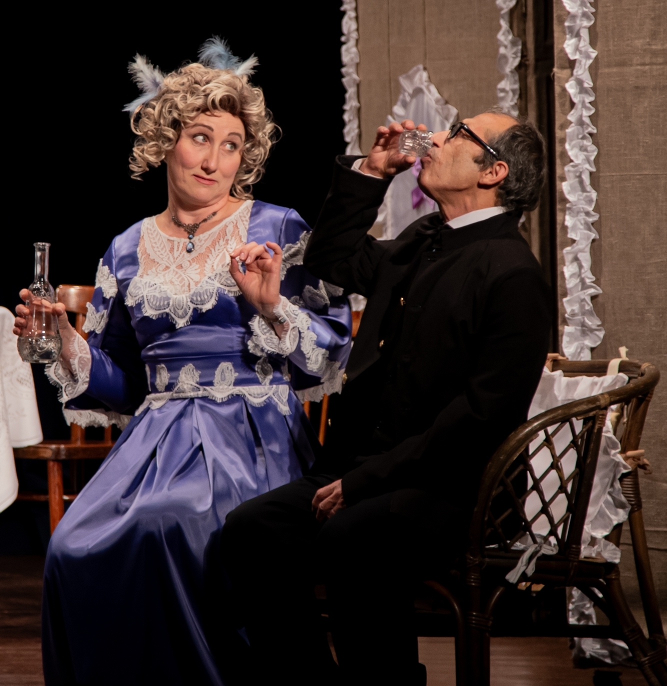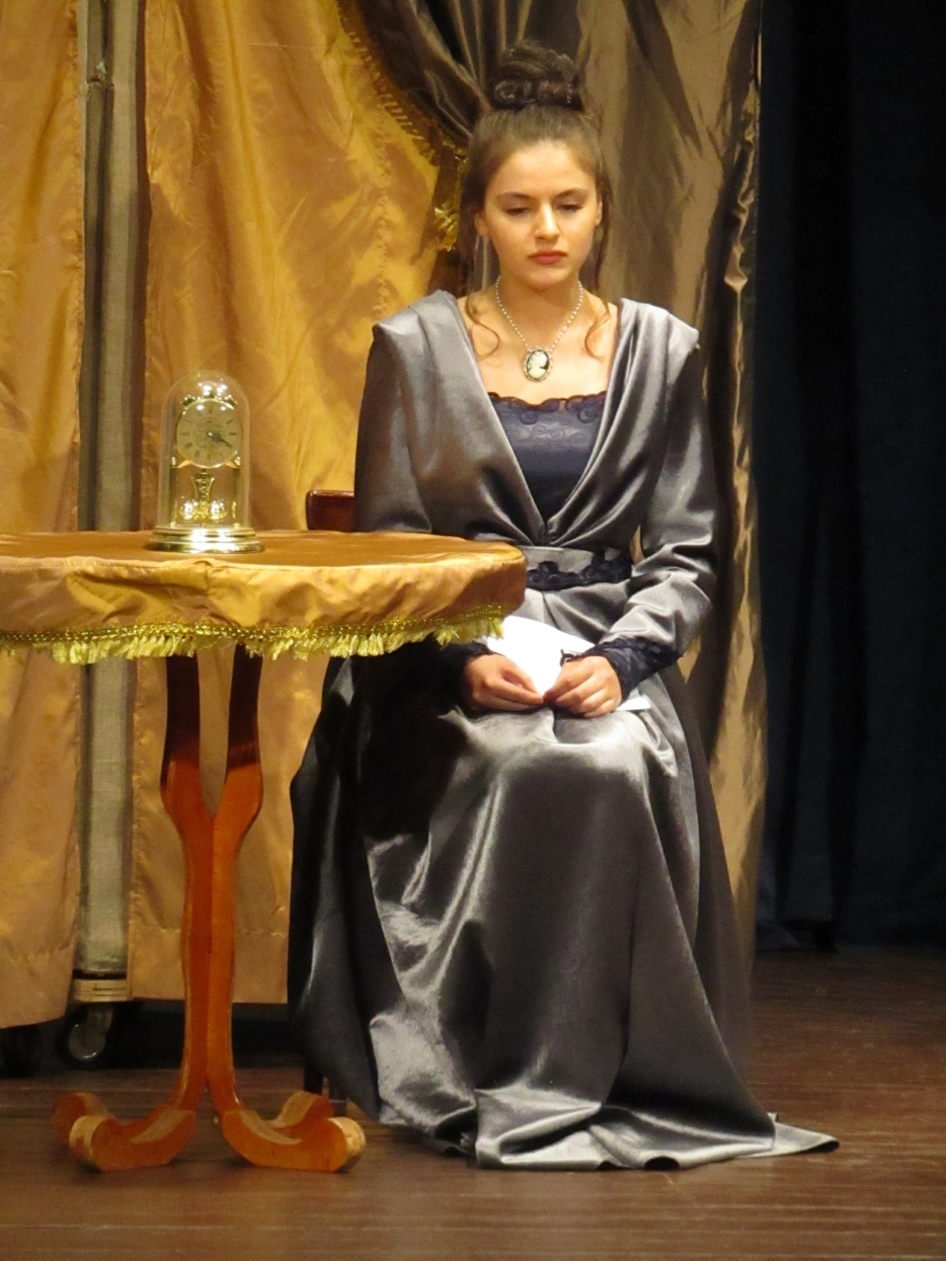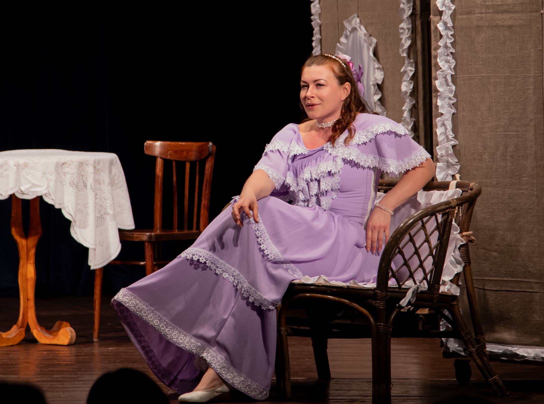 Наталья Седова в роли Кукушкиной. Сложная роль женщины с судьбой - Анны Павловны Вышневской была отдана двум молодым актрисам - Ольге Яловой и Карине Бархударян. Результат превзошел все ожидания! Сыграть молодую, умную, тонкую, духовно богатую женщину в плену у лживого, привыкшего подменять понятия, жестокого старика - это задача на вырост для любой актрисы. В этой роли мало внешней выразительности, но много внутреннего чувства, скрытого бунта, ожидания развязки и желания свободы. Финальный монолог, обличающий чиновника Вышневского, - это одно из самых сильных мест пьесы. Прозвучи он слабо, неубедительно и финал окажется слабым. К чести обеих актрис финальный монолог вышел на тот градус, на котором он должен звучать. Ольга Яловая - безупречная леди в этой роли. Образ благородной дамы, обладающей манерами, красавицы, воспитанной в дворянской семье, как нельзя лучше подошел Ольге. Она подчеркнуто скупа в движениях, но видно что ее возмущает, кого она презирает, а кому сочувствует. Видна ее внутренняя жизнь. В финале чувствуется нерв Вышневской, чувствуется как ей больно и трудно говорить разоренному мужу слова правды. Но вместе с этим ощущается ее прорыв к желанной свободе.
