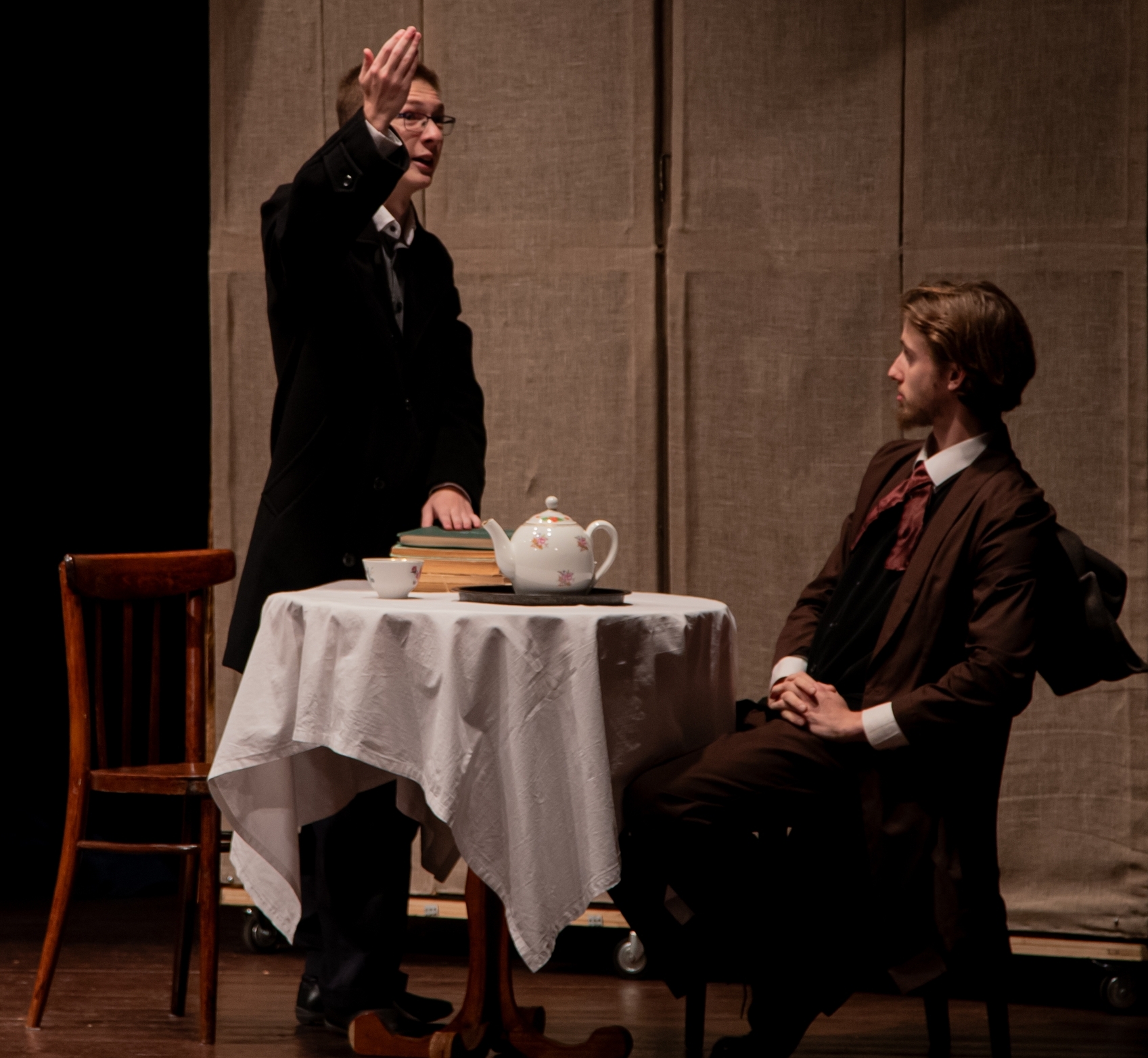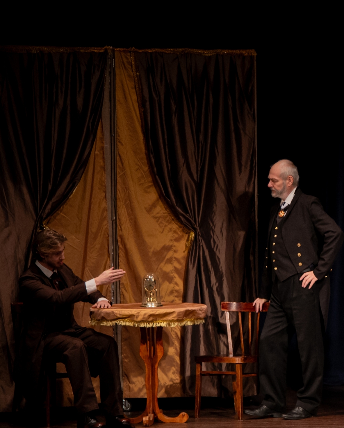 Даниил Овчаренко в роли Мыкина, Денис Лученков в роли Жадова. Слуги в доме Вышневского - роли, обязывающие артистов в одноминутном выходе дать всю чопорность богатого особняка. Короля играет свита, и именно слуги задают тон "хорошего дома", вовремя появляясь и вовремя исчезая. В этих ролях очень органично существовали Ксения Пономарева, Оксана Кабаева, Дмитрий Саламахин. Для Дмитрия это был дебют вдвойне - будучи воспитанником студии, он впервые принял участие во взрослом спектакле. Все артисты были щедро награждены зрительским признанием. Ну, а "корифеи", - Алексей Цымбал и Расул Османов, конечно, получили самые горячие аплодисменты зрителей. Артистов в этих ролях уже видели и в зале были зрители, желающие посмотреть на своих любимцев и сравнить их игру с игрой в "Доходном месте" прошлых лет. Алексей Цымбал стабилен в передаче основных черт характера Вышневского, но добавил ему возраста, солидности и язвительности. В отношении Расула Османова все зрители единодушны - он не играет, он живет на сцене. Что сказал зритель. На спектакле от 24 октября присутствовал Заслуженный артист Московской области, актер театра драмы и комедии "ФЭСТ" Сергей Викторович Гришаков. Он дал подробную обратную связь артистам и режиссеру о прошедшем спектакле. Добрые советы по улучшению отдельных сцен и ролей всегда нужны от добрых друзей и старших товарищей. Вся творческая группа спектакля и отдельные посвященые зрители с интересом и благодарностью выслушали мастера сцены и приняли к сведению замечания. Не менее интересны и важны стали для труппы театра и отзывы зрителей. Татьяна Пронина. "Отличный спектакль! Прекрасные костюмы, декорации, глаз радуется! Вера Сорокоумова. "Вчера после работы смотрела постановку. Мария Гришмановская. "С опозданием, но от всей души - с ПРЕМЬЕРОЙ ваш прекрасный театр! Слово о костюмах. Не было бы новых костюмов от Натальи Седовой, впечатление от спектакля было бы не полным. Художник по костюму и мастер своего дела Наталья Седова обновила костюмы, оставшиеся от 2015 года и создала целую коллекцию новых. Ансамбли костюмов Вышневской и Вышневского, Жадова, Полины, Кукушкиной вызывали у зрителей неподдельное восхищение. Да что там - у зрителей! Сами артисты были в восторге от тех прекрасных вещей, в которых им предстояло создавать образ своего героя. Искусство создания костюма для спектакля - это наука, без которой театр не живет. Верхом изящества и мастерства художника стали дамские шляпки, идентичные эпохе Островского. При лаконичной сценографии "Доходного места" костюмы придают спектаклю дополнительную зрелищность и красоту. Наталья Седова - тонкий художник, уделяющий внимание каждой детали и аксессуару - даже галстуки для мужчин были сделаны по образцу 19 века. "Браво" из зрительного зала, раздававшееся на поклонах, безусловно, принадлежит труду нашего художника по костюмам.
