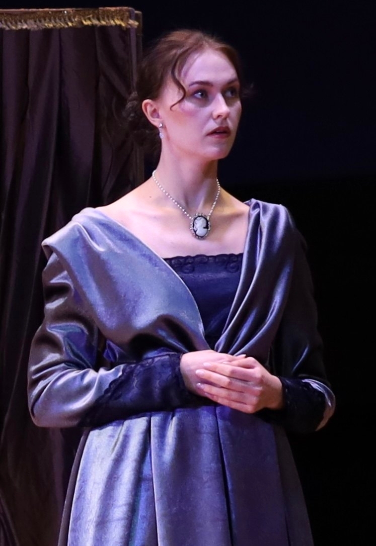 Ольга Яловая (слева) и Карина Бархударян (справа) в роли Вышневской. В Вышневской Карины Бархударян угадывается отчаянная натура, нетерпимая, решительная, но слишком молодая и неопытная, чтобы открыто бунтовать против возрастного супруга. Тем неожиданнее для него оказывается ее финальная речь, полная горечи за свою молодость, которую ей пришлось провести со стариком. А в конце монолога слышна гордость за то, что она все-таки сумела сказать ему то, что в ней копилось годами. Сама роль Вышневской стала для Карины прорывом к новому этапу актерской игры - проживанию на сцене чувств героини. Это новый опыт, который обязывает к постижению новых сложных ролей. Полина. Роль Полины - молодой жены главного героя Василия Жадова исполнила Валерия Житникова. Начав с комедийных ролей в водевилях, актриса укрепляется в ролях лирических героинь. Роль Полины в "Доходном месте" легко сыграть, как роль доверчивой простушки, не умной и поверхностной. В некоторых постановках её так и трактуют. Но это ошибочное мнение. Подруга героя, готовящего себя к борьбе, не может быть "дурочкой". Полина написана Островским девушкой с чистым сердцем, бесхитростной, доброй и искренней. Она способна на подвиг любви, способна быть поддержкой для своего любимого, иначе как объяснить, что честный и умный герой выбрал именно её. Ей трудно преодолеть привычки, приобретенные ею в доме Кукушкиной, трудно прежить бытовые неудобства. В какой-то момент она становится жертвой манипуляций своей маменьки и сестры и восстает против мужа, но её собственное чувство правды спасает их любовь и помогает Жадову обрести помощницу, о которой он мечтал. Валерия Житникова прекрасно передает в первом акте непосредственность Полины, её мечтательность и доверчивость, а во втором хорошо видно, как она сначала пытается отстоять мужа перед матерью и сестрой, как не сразу поддается их давлению. Сложную гамму чувств Полины, когда она уговаривает мужа пойти на поклон к дяде, вместе с актрисой переживал весь зал, становясь то на её сторону, то на сторону Жадова. И когда в финале она вернулась к мужу, зал принял это как единственный закономерный выбор Полины.